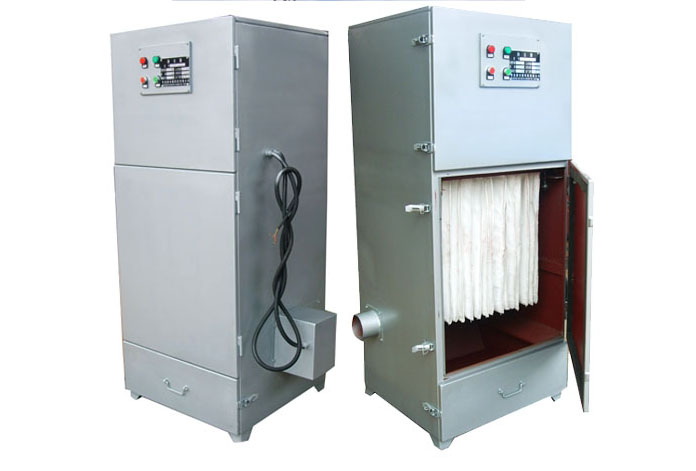 含尘气体由除尘罩吸入箱体,经滤袋进行过滤,粉尘被滤袋阻留在外表面,净化后的气体由风机经出风口排出,可直接排入室内,也可根据需要排出室外。随着主机连续工作,滤袋表面的粉尘不断增加,继而进行清灰,粉尘抖落在集尘器(抽屉)中,再由人工进行处理。